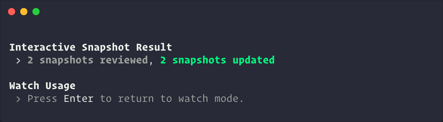 flag to re-generate snapshots if you prefer. This will re-generate snapshot artifacts for all failing snapshot tests. If we had any additional failing snapshot tests due to an unintentional bug, we would need to fix the bug before re-generating snapshots to avoid recording snapshots of the buggy behavior.